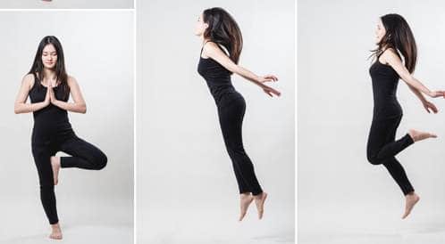 - انقل وزنك نحو جانبك الأيمن، ثم ارفع قدمك اليسرى من على الأرض (ب)