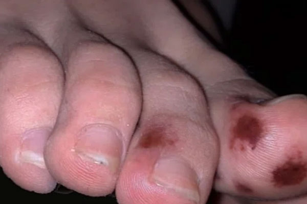 ووفقا لصحيفة ديلي ميل البريطانية، فإن ظهور علامات كدمات على القدمين قد تعد من علامات إيجابية الإصابة بفيروس كورونا، وهي تظهر على شكل بقعة أرجوانية اللون تشبه علامات الإصابة بمرض الجدري المائي.
