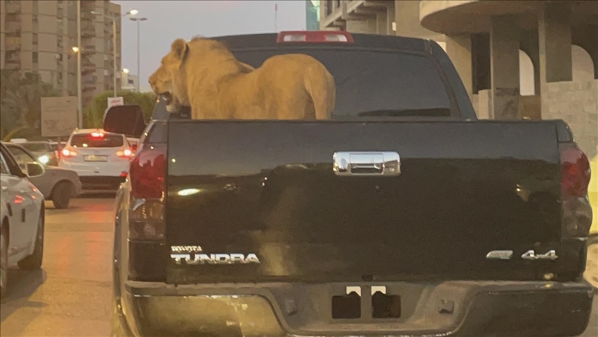 في مشهد لافت للأنظار، رصدت عدسة كاميرا، سيارة (بيك آب) تحمل أسدا غير مقيد في صندوقها الخلفي وسط العاصمة الليبية طرابلس،