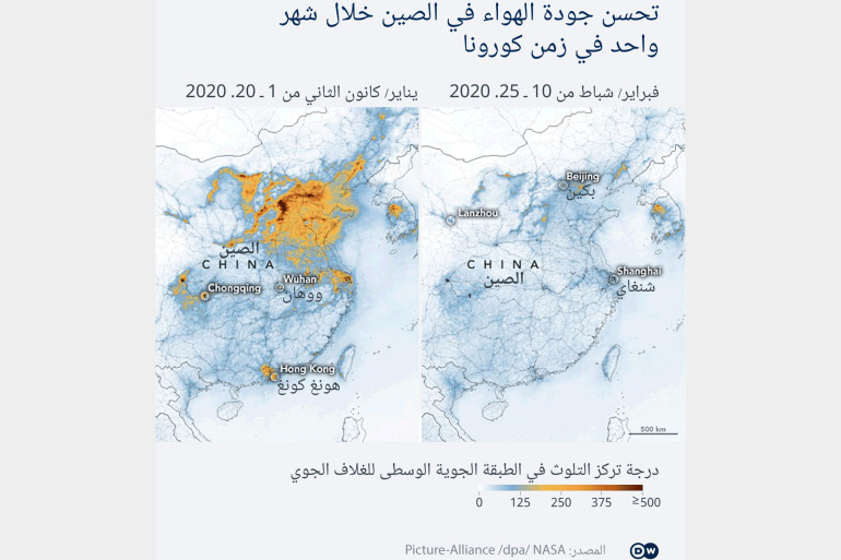 في شهر فبراير/شباط من العام الجاري، انتشرت صور لوكالة الفضاء الأميركية “ناسا” (NASA) التقطتها أقمار صناعية فوق الأجواء العليا في الصين، أظهرت كيف تراجع مستوى تلوث الهواء هناك بعد فرض الحجر الصحي بسبب جائحة كورونا.