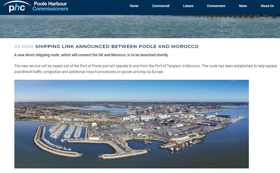 أعلن الموقع الرسمي لميناء بول البريطاني، عن قرب افتتاح الخط البحري المباشر لنقل البضائع البريطانية من وإلى المغرب وافريقيا، لتفادي التأخر الحاصل خلال تنقلها بريا عبر بلدان الاتحاد الاوروبي.