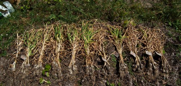 - حينما تكون السيقان صفراء أو بنية فإن الثوم يكون جاهزاً لعملية الحصاد، وذلك في آخر فصل الصيف، وينبغي التنويه أن عملية الحصاد تستمر لفصل الخريف.
