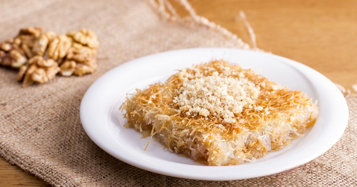 7- في طبق كبير للتقديم، ضعي طبقة أولى خفيفة من الشعيرية ، أسكبي القشطة ثم ضعي الكمية المتبقية من الشعيرية.