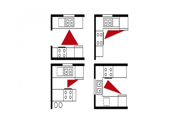 - وتشكل تلك المحطات الثلاث بالمطبخ رؤوس المثلث الثلاثة، بحيث تقاس أضلاع المثلث من مركز كل منهم، فتكون الثلاجة في أقرب مكان للباب فلا يضطر من يريد استخدامها التوغل في المطبخ، ويكون حوض الغسيل في أقرب مكان للإضاءة، أما الموقد (البوتاجاز) فيكون في أقرب مكان لمصدر التهوية. ولأفضل النتائج يفضل أن يتراوح محيط مثلث الحركة في المطبخ ما بين: (4 : 8) متر، وكل ضلع للمثلث يجب أن لا يقل طوله عن(1,25) متر، ولا يزيد عن (2.75) متر.
