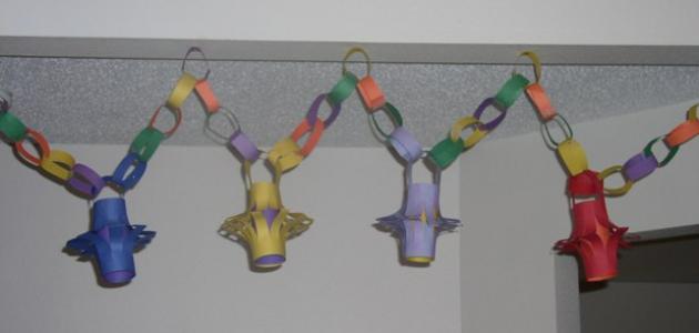 - قص الورق الملون بأشكال مستطيليه بطول 30 سنتيمتر وعرض 3 سنتيمتر، ومن ثم كبس الأطراف ببعضها لتتكون الحلقة الأولى، وبعدها يتم إدخال المستطيل الآخر في الدائرة الأولى ومن ثم كبس أطرافه، وتكرار العملية مع باقي الورق، ليتكون بذلك سلسلة ملونة جميلة، يمكن كتابة بعض العبارات عليها، أو يمكن إلصاق الستيكرز عليها.