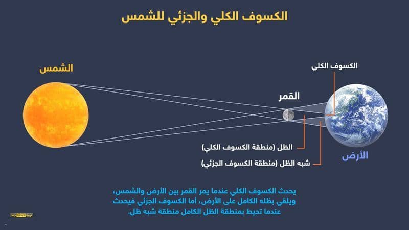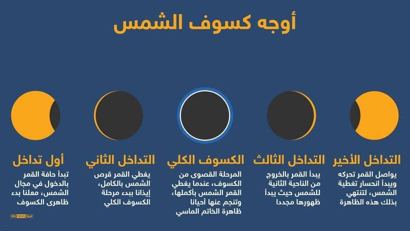 الإنفوغرافيك المرافق يظهر كل ما يراد معرفته بشأن الكسوف وأنواعه، بما في ذلك الكسوف الحلقي ومساره والمدن والمناطق العربية التي سيمر بها، بالإضافة إلى مدته ونسبته.
