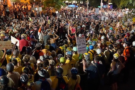 بعد الساعة الثامنة مساء بالتوقيت المحلي، بدأت أعداد المتظاهرين تتزايد في محيط المحكمة والشوارع المؤدية لها، خصوصا بعد تأكيد تيد ويلر، عمدة المدينة، حضوره هذه الاحتجاجات لأول مرة منذ اندلاعها قبل حوالي شهرين.