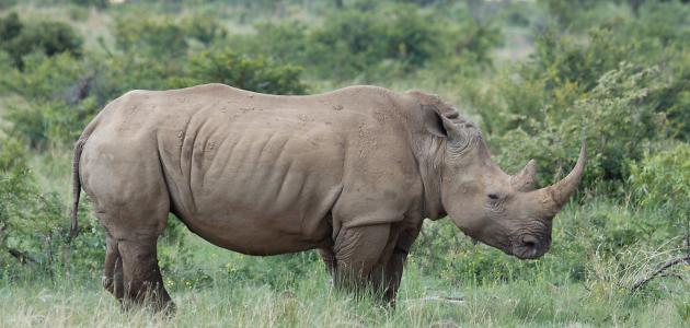 - وحيد القرن الأبيض (بالإنجليزية: white rhino): يُعرف وحيد القرن الأبيض علمياً باسم Ceratotherium simum، ويكون لون جلده رمادياً وليس أبيض كما يوحي اسمه، ويعيش في إفريقيا، وتحديداً في جنوب إفريقيا، وزمبابوي، وسوازيلند، وتنزانيا، وأوغندا، وبوتسوانا، وناميبيا، وكينيا، يتراوح وزنه ما بين (1800- 2700) كيلوغرام. متوسّط عمر وحيد القرن الأبيض في البريّة ما بين (35-45) عاماً، وقد يَصل في بعض الأحيان إلى خمسين عاماً، وازدادت أعداده في البرية حتى بلغت (20.170) فرداً، إلا أنّه لا يزال يتعرض للصّيد غير المشروع.[٣]