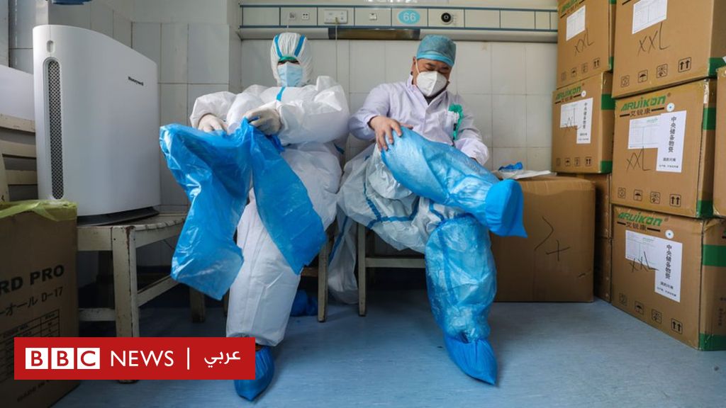 عاملان طبيان يرتديان ملابس واقية في مستشفى لعلاج مرضى فيروس كورونا في ووهان بالصينGetty Images