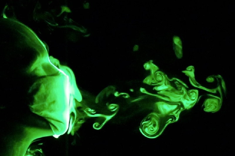 ولمحاكاة السعال، قام الباحثون بتوصيل رأس نموذج الاختبار بآلة الضباب (التي تخلق بخارا من الماء والغليسرين)، واستخدموا مضخة لطرد البخار من خلال فم النموذج. ثم تصوروا قطرات البخار باستخدام “لوح ليزر” تم إنشاؤه بتمرير مؤشر ليزر أخضر من خلال قضيب أسطواني. وبذلك، يظهر السعال على شكل بخار أخضر متوهج يتدفق من فم النموذج.
