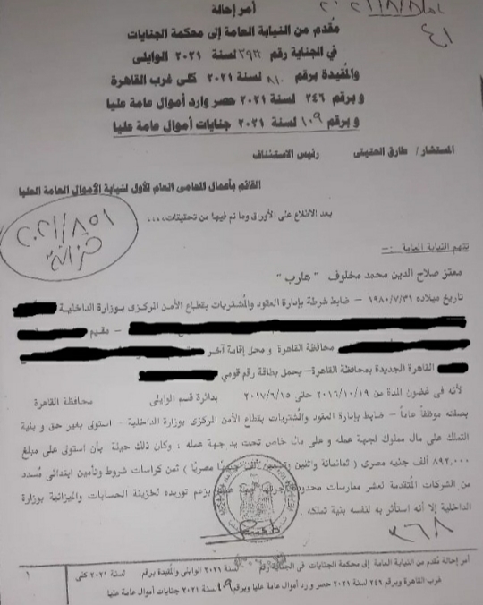 حملت القضية الرقم 246 لسنة 2021 حصر وارد أموال عامة عليا، وقيدت تحت رقم 109 لسنة 2021 جنايات أموال عامة عليا، والمتهم فيها هو “العقيد م ص م (41 عاما) ضابط شرطة ومسؤول بإدارة العقود والمشتريات بقطاع الأمن المركزي بوزارة الداخلية المصرية”.