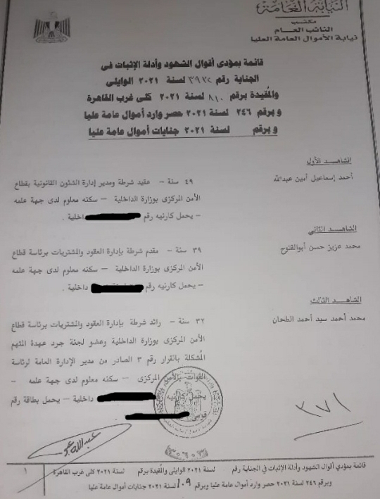 وهم، “العقيد أحمد إسماعيل أمين – 49 سنة – عقيد شرطة ومدير إدارة الشؤون القانونية بقطاع الأمن المركزي بوزارة الداخلية، والمقدم محمد عزيز أبو الفتوح -39 سنة – مقدم شرطة بإدارة العقود والمشتريات برئاسة قطاع الأمن المركزي بوزارة الداخلية، والرائد ومحمد أحمد الطحان – 32 سنة – رائد شرطة بإدارة العقود والمشتريات برئاسة قطاع الأمن المركزي بوزارة الداخلية”.