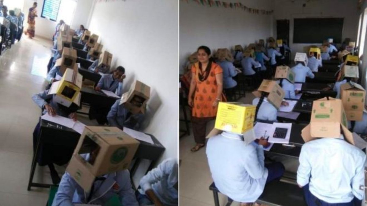 وأظهرت الصور الطلاب وعلى رؤوسهم صناديق مفتوحة من جانب واحد، وذلك لمنعهم من الغش.