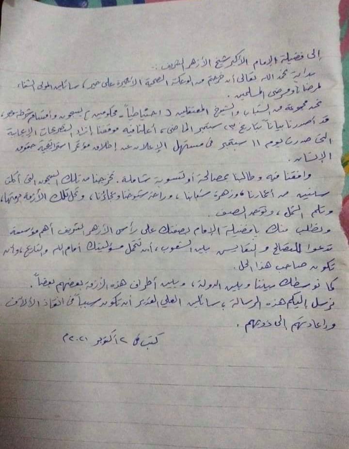 فيما لا تعدّ تلك المناشدة لشيخ الأزهر هي الأولى من نوعها؛ فقد طالب معتقلون آخرون، خلال شهر أيلول/ سبتمبر 2019، أحمد الطيب بالتوسط بين النظام والشباب في السجون لوضع خريطة لإنهاء هذه الأزمة، ووقف أضرارها على الوطن وأبنائه.