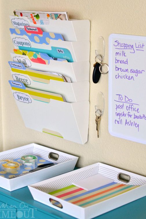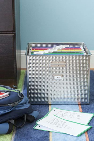 أنشيء آلية لتخزين الملفات في المنزل لتخزين أوراق العام الدراسي بأكمله إمَّا ضمن صندوق خاص بالملفات وإمَّا ضمن درج إحدى الخزانات. وخصص لكل مادة مجلداً خاصاً ملوناً بلونٍ يميزه، إذ إنَّ هذه الطريقة لا تمنح الأطفال مكاناً لإفراغ أوراق المهمات التي انتهوا منها فحسب بل تساعدهم كذلك على تنظيم وثائقهم بعد انتهاء الفصل الدراسي.