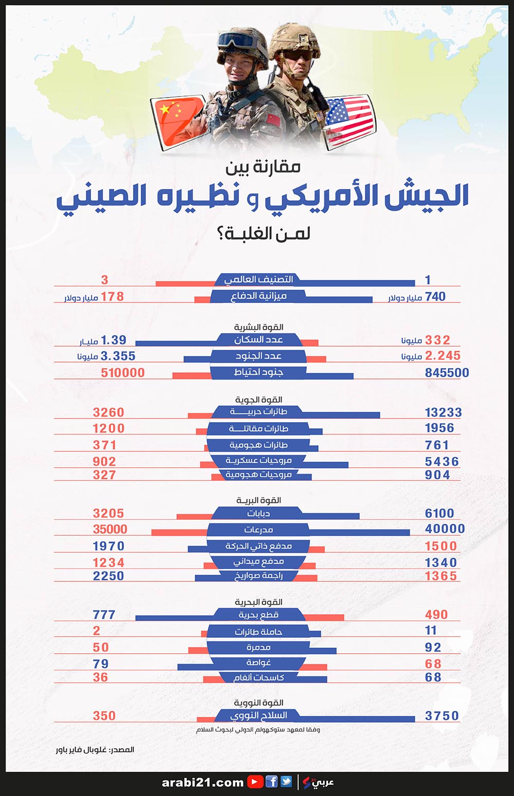 في الإنفوغراف أدناه مقارنة بين الجيشين الأمريكي والصيني بحسب موقع “غلوبال فاير باور” العالمي المختص بالشؤون العسكرية: