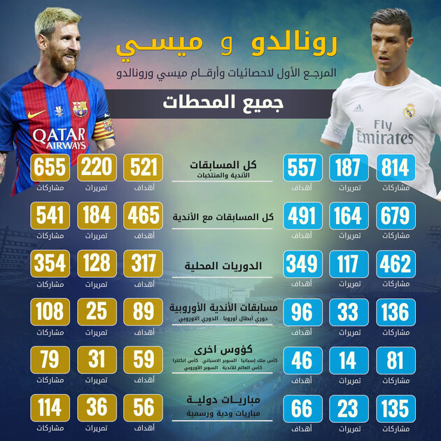 مقارنة بين ميسي ورونالدو وفق احصائيات متنوعة للنجوم المعروفين في عالم الرياضة العالمية والذين لهم قاعدة جماهيرية كبرى في انحاء العالم، النجم الكاتلوني البرشلوني ليوينل ميسي والنجم الملكي لريال مدريد كريستيانو رونالدو مقارنة رهيبة وجميلة للاعبين الأفضل في الدوري الإسباني ودوري أبطال أوروبا، فهذان اللاعبان يعتبران من الأعمدة الأساسية في ناديي برشلونة وريال مدريد، لهذا قمنا بجمع افضل الاحصائيات الرقيمة لادائهم والسرعة الخاصة بهم والاهداف وغيرها ستكون ضمن مقالنا مقارنة بين ميسي ورونالدو.