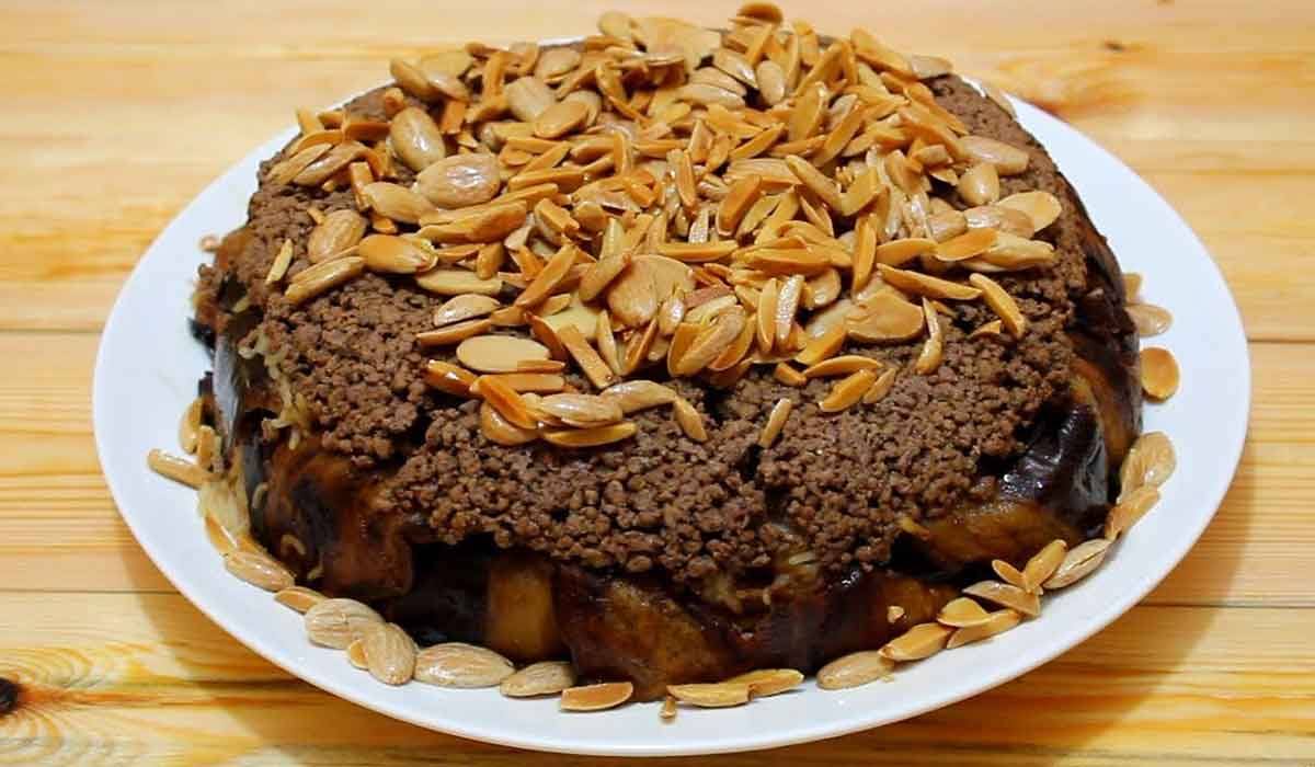 - تخرج الوصفة من الفرن ويتم قلبها ثم وضع اللوز المحمص عليها للزينة أو الخضروات المفضلة.
