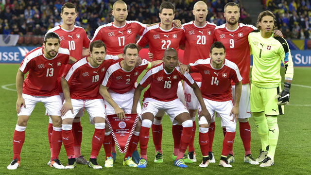 خط الدفاع: يوهان دجورو (أنطاليا سبور التركي)، ونيكو إلفيدي (بوروسيا مونشنجلادباخ الألماني)، وميكايل لانج (بازل)، وستيفان ليختشتاينر (يوفنتوس الايطالي)، وفرنسوا موباندجي (تولوز الفرنسي)، وريكاردو رودريجيز (ميلان الإيطالي)، وفابيان شار (ديبورتيفو لا كورونيا الإسباني)، ومانويل أكانجي (بوروسيا دورتموند الألماني).