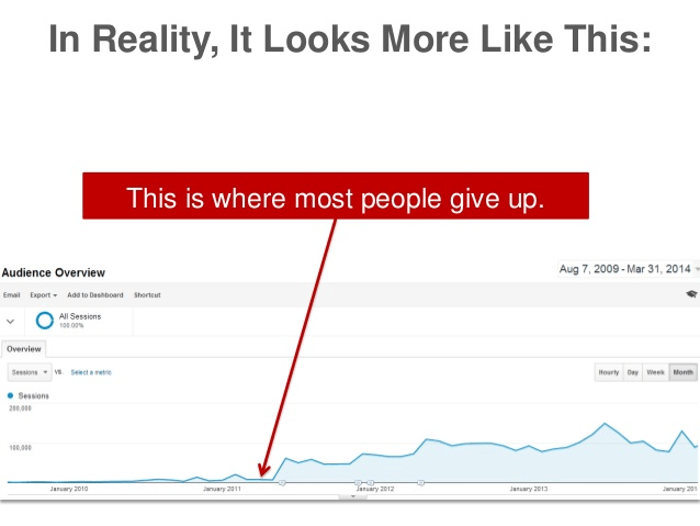 مثلما ترى من خلال هذا التوضيح يُحقّق العديد من المُسوّقين بالمحتوى طفراتٍ من النجاح في البداية، ومن ثمَّ يرون حركة مرور البيانات تتراجع إلى مستوياتها “الاعتيادية” ويستسلمون قبل أن تبدأ الانطلاقة الحقيقية، فاصمد ولا تكن كالعديد من المسوقين بالمحتوى.