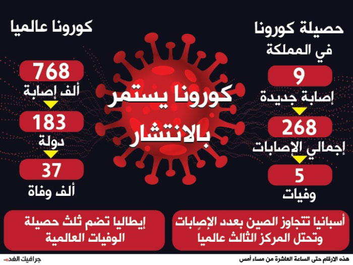 وتأكدت رسميا إصابة أكثر من 768 ألف شخص في 183 دولة ومنطقة. غير أنّ هذه الحصيلة لا تعكس سوى جزء من الأرقام الحقيقية، لأنّ عددا كبيرا من الدول لا يجري فحوصا إلا للحالات التي تستوجب النقل إلى المستشفيات. وتماثل إلى الشفاء 160 ألف شخص على الأقل حتى مساء أمس.