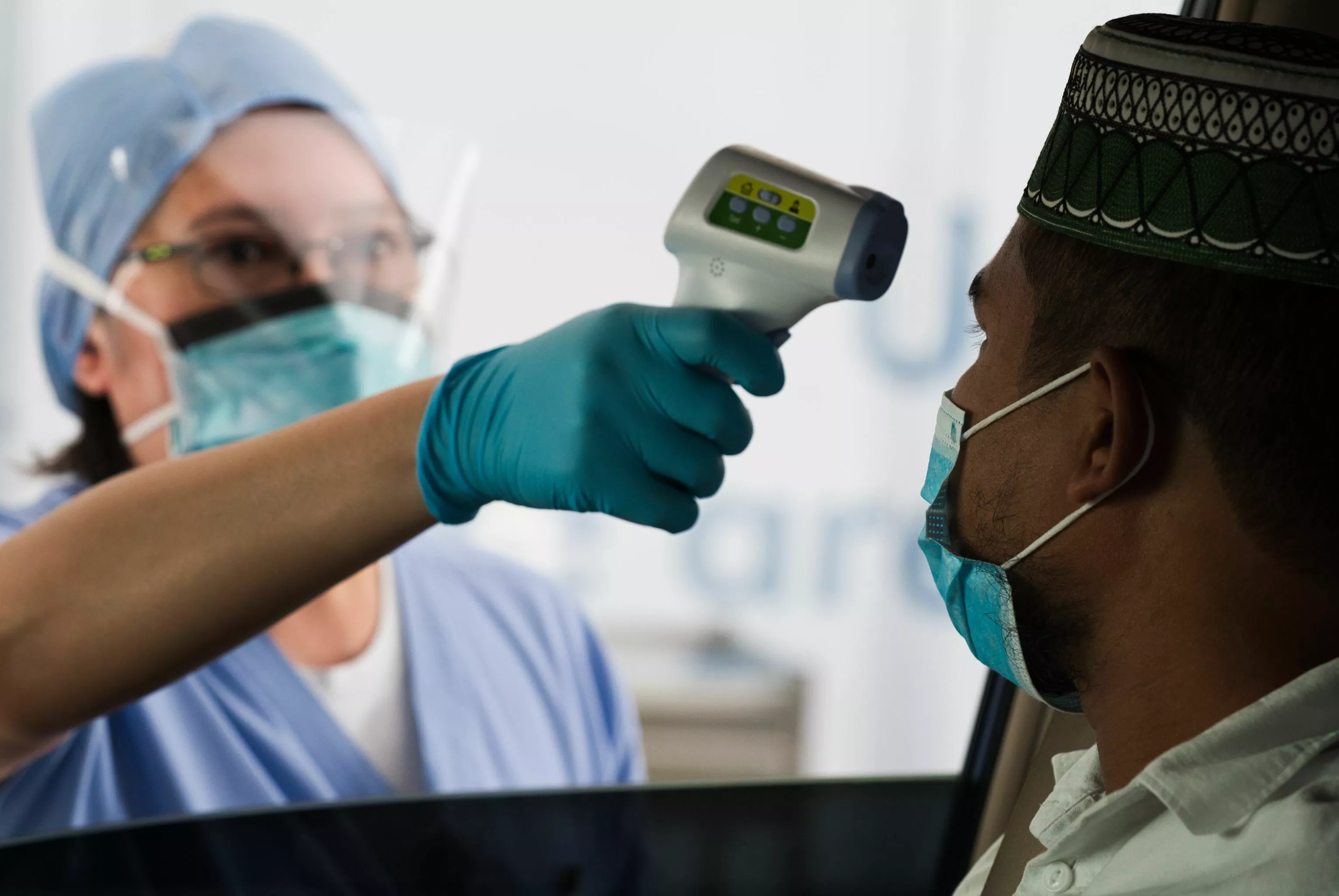 فني يتحقق من درجة حرارة الرجل قبل إجراء اختبار جديد للكشف عن فيروس كورونا في منشأة اختبار القيادة في أبو ظبي