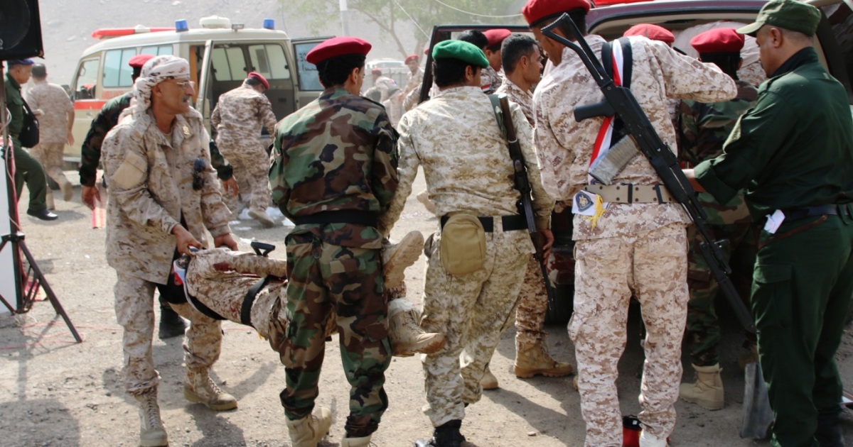 جنود يمنيون ينقلون زميلا لهم أصيب في هجوم على عرض عسكري في عدن عام 2019 (رويترز)