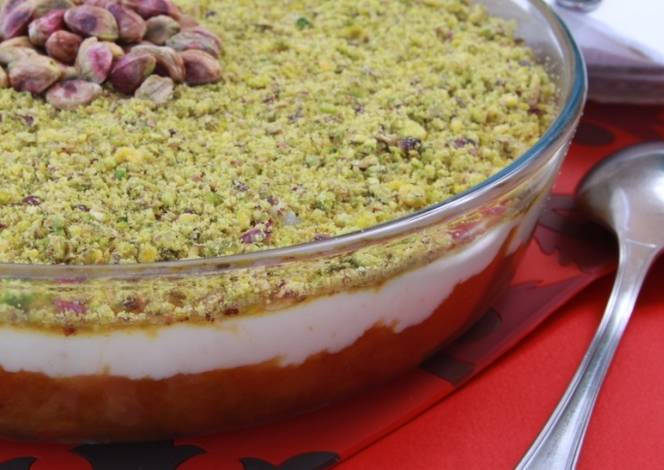 - نحمرها في الفرن من الأسفل أولاً ثم من الأعلى ونقلبها في صحن التقديم ونصب عليها الشربات والفستق على الوجه .