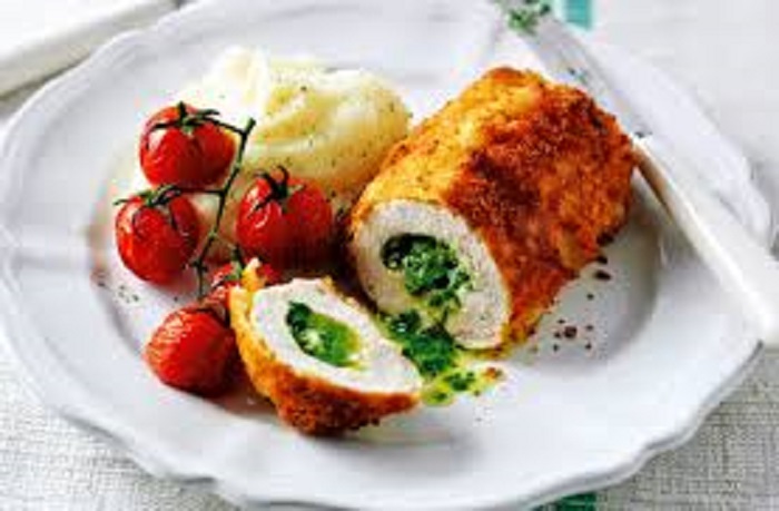 - نحشو الدجاج بالجبن المخلوط مع البقدونس ونلف على شكل رول .