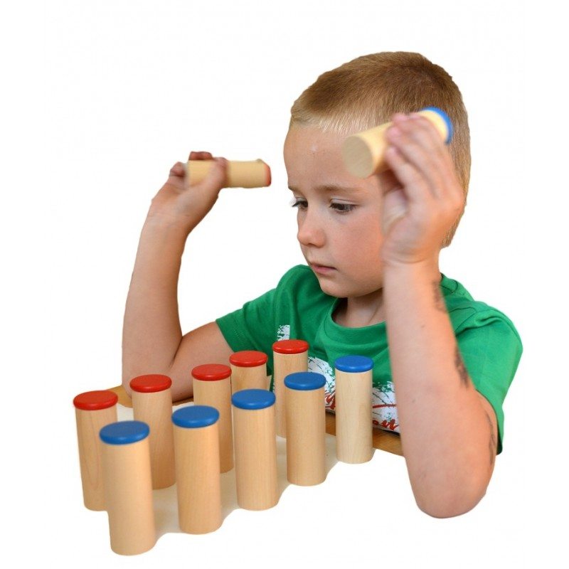 ثم تخرج المعلمة الثلاث إسطوانات الزرقاء المماثلة للثلاث إسطوانات الحمراء الموضوعة على الطاولة، ثم تأخذ أول إسطوانة حمراء ثم تهزها وتسمع صوتها بكلتا أذنيها ثم تضعها وتمسك بأول إسطوانة زرقاء وتمسكها وتهزها وتستمع إليها بكلتا أذنيها فإن كانت تطابق الإسطوانة الحمراء وضعتها أمامها وإن لم تكن تطابقها تضعها جانبا وتسمع الإسطوانتان الزرقاوتان لتصل للإسطوانة المتطابقة للإسطوانة الحمراء وهكذا حتى تطابق الثلاث إسطوانات الحمراء بالزرقاء، ويجب التأكيد على عدم هزر الإسطوانات كلها بنفس الوقت وأيضا عدم التحدث أثناء الإستماع للإسطوانة، ثم ترص المعلمة الثلاث إسطوانات الحمراء في صف بعيد عن الزرقاء على أن يكون ذلك بدون ترتيب وتدع الطفل يقوم بما قامت هي به ليطابقهم مع بعض.