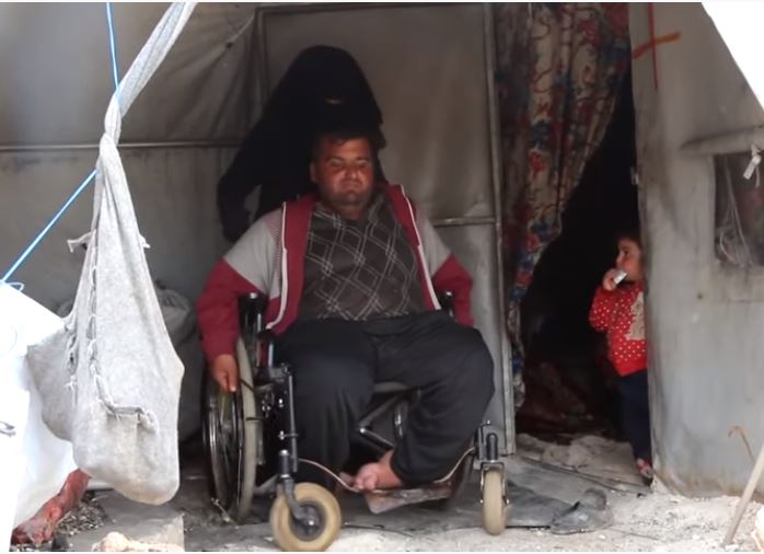 كرسي متحرك، وغرفة تقيه وطفلتيه نار الصيف وزمهرير الشتاء، ومصدر رزق.. هذه كل أحلام النازح السوري خالد المصاب بشلل نصفي منذ طفولته.