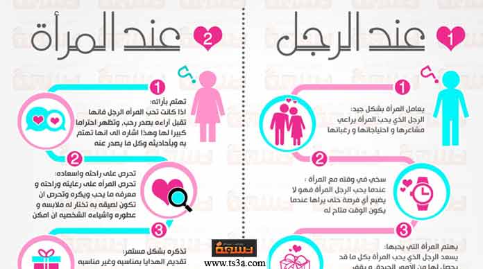علامات عديدة قد تلاحظها عند الرجل او عند المرأة عندما يكونان في حالة حب . اليك انفوجرافيك عربي بالصورة عن كيفية معرفة علامات الحب عند الرجل والمرأة